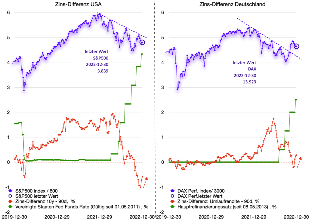 • Die Zins-Differenzen (lang – kurzfristig) drehen nach oben (rote Pfeile im Chart). Damit ist zwar noch kein Bullenmarkt angesagt – aber die Richtung stimmt. In den USA drehte 1970/71 (1. Inflationswelle) der Inverse Zins auch bei ca. –1% und eine Aktien-Rallye folgte.