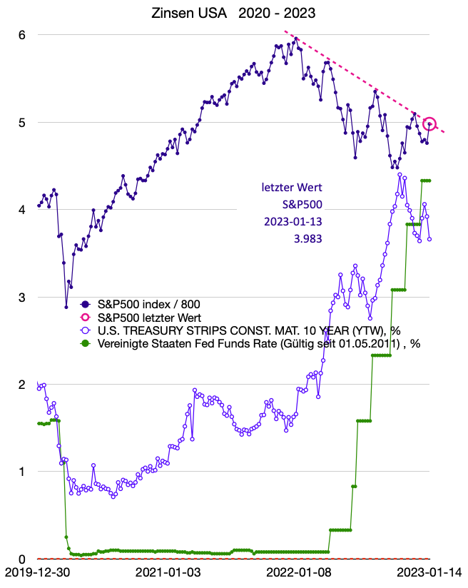 1. Am einfachsten füge ich Dir zu den US-Zinsen den Chart bei, vor dem ich gerade sitze. Die FED hält bisher den Zentralbanksatz bei jeder Stufe 6 – 8 Wochen lang konstant. Nach den kürzlichen deutlichen Statements von FED-Mitgliedern wäre es eine sehr grosse Überraschung, wenn das OFMC mit Erhöhungen nun ganz Schluss machen würde. D. h. in ca. 2 Wochen sollte ein weiterer Schritt kommen, der dann auch die langfristigen Z. mit hochzieht – ein Stück wenigstens.