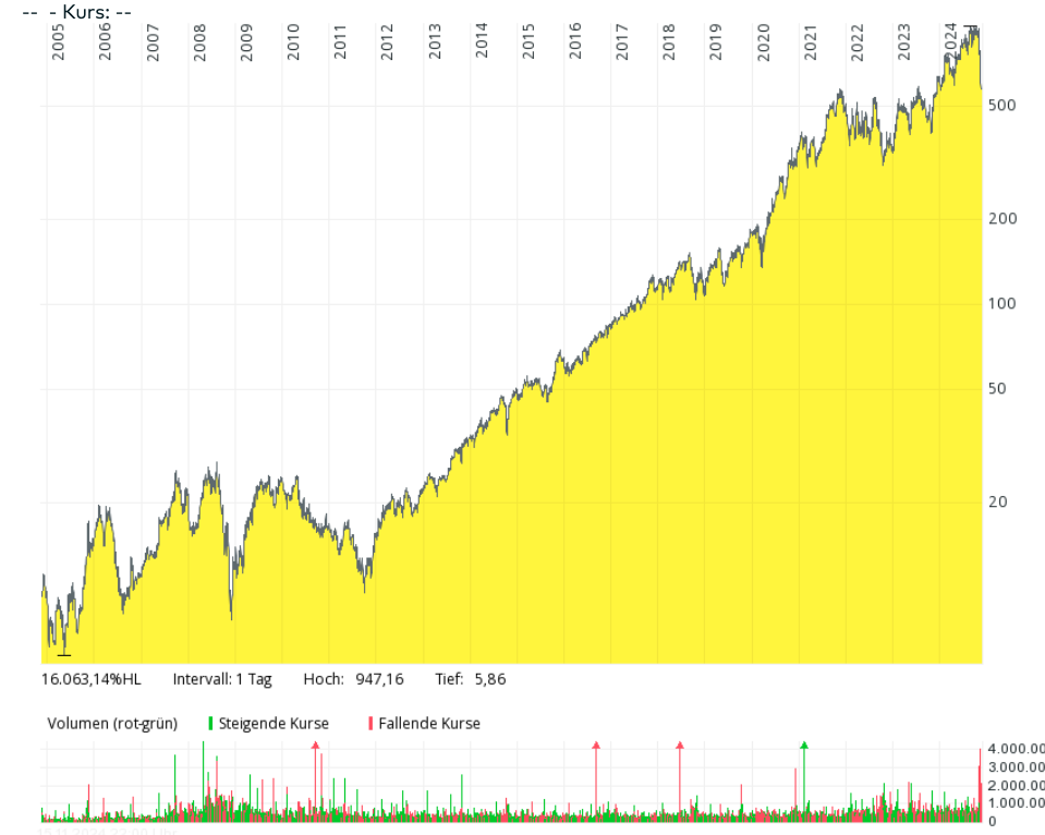 Die Aktie hat es in den letzten 19 Jahren auf durchschnittlich 27% Rendite pro Jahr gebracht ‼️‼️Dividenden kommen noch dazu. Und mit der hohen EK-Quote hat sie sich meiner Einschätzung nach endgültig zum WahrenPremiumWert qualifiziert.
