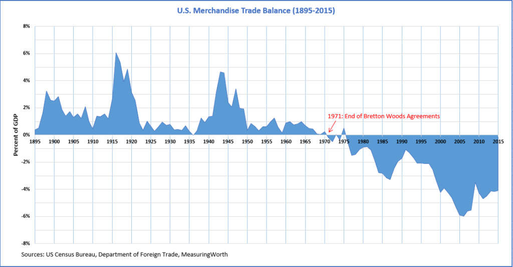 Hier mal ein interessante Grafik. Man erkennt, dass das Handelsdefizit der USA nach dem Ende von Bretton Woods negativ wurde. Zufall?