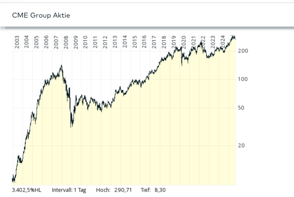 Da ich weder das Know How noch die Nervenstärke für Options Handel und/oder ähnliches habe, habe ich geschaut wie ich bei einem „Schaufelhersteller“ investieren kann, um trotzdem an diesem Markt zu partizipieren. Hier fand ich die CME Group (A0MW32)