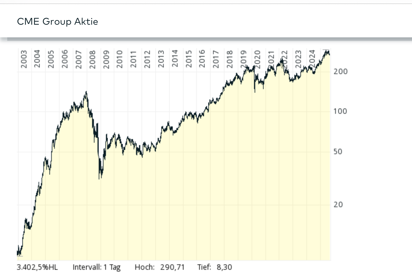 Ich habe CME mit dem Nasdaq verglichen (beide ohne Dividende): Seit 2003 ist CME wesentlich besser, seit 2020 sind beide ungefähr gleich.