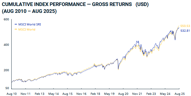 Da drängt es sich doch auf, mal den MSCI World Index mit dem MSCI World SRI Index zu vergleichen (letzterer basiert auf ESG-Kriterien), siehe Grafik.