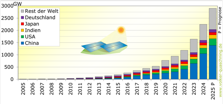Photovoltaik, international (das Jahr 2025 ist dabei nur eine Prognose):