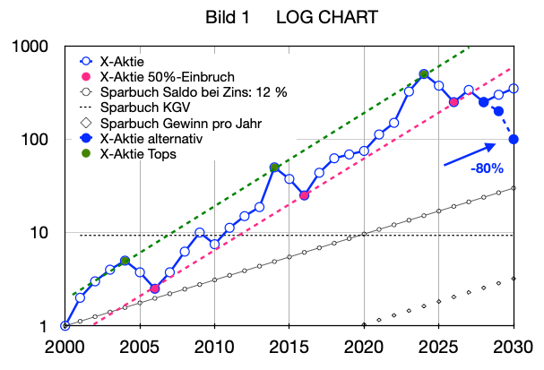 BILD 1. LOG-Chart. Diese X-Aktie hat bei 5, 50, 500 Hochs und 3 Einbrüche von je 50% auf 2,5, 25, 250. Für den sehr langfristigen Investor (WW) ist ein simples und robustes System für den Ausstieg natürlich das Durchbrechen der roten Trendlinie eine naheliegende Basis oder/und ein Tief von in diesem Beispiel < 50%. Jener hat sich schon beim Einstieg damit abgefunden, dass er evtl. mehrere 50% Einbrüche durchstehen muss, aber rechnet unter dem Strich mit einem relativ hohen Zuwachs – wenn alles SO sich fortsetzt. Auf dem Chart ist zu sehen, dass in dieser logarithmischen Darstellung die unmittelbare Vergangenheit etwas „verharmlost“ erscheint. Die -80% stehen sehr weit oben im Chart und – je nach Übung – wird beim ersten Durchsehen gerne unterschätzt, dass die Hütte schon im „sehr oberen“ Bereich des LOG-Charts zu brennen anfangen kann.