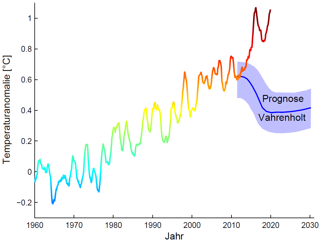 Beispiel: Herr Vahrenholt hat auf Grundlage seiner Theorien eine deutliche Abkühlung prognostiziert (siehe Grafik). Aber das Gegenteil ist eingetroffen (die Grafik ist nicht mehr ganz up-to-date, der Temperaturanstieg ging noch weiter). Seinem Lebenslauf nach ist er auch kein Klimawissenschaftler. Stimmt das? Sollte man ihm in Klimafragen dann Glauben schenken?