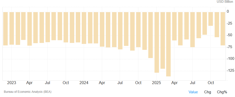Spannend bleibt, ob und wie stark es den USA gelingt, dass Handelsdefizit zu dauerhaft zu verringern, und was die Begleitfolgen sind. Das bisherige Ergebnis der Zollpolitik ist gemischt. In den Monaten vor dem „Liberation Day“ gab es zunächst noch Hamster-Importe, anschließend kam der zumindest kurzzeitig zu erwartende Rückgang des Handelsdefizits. Ab November ist es dann wieder gestiegen. Im Dezember lag es schon fast wieder auf Ausgangsniveau. Siehe Grafik (Quelle: https://de.tradingeconomics.com/united-states/balance-of-trade ).